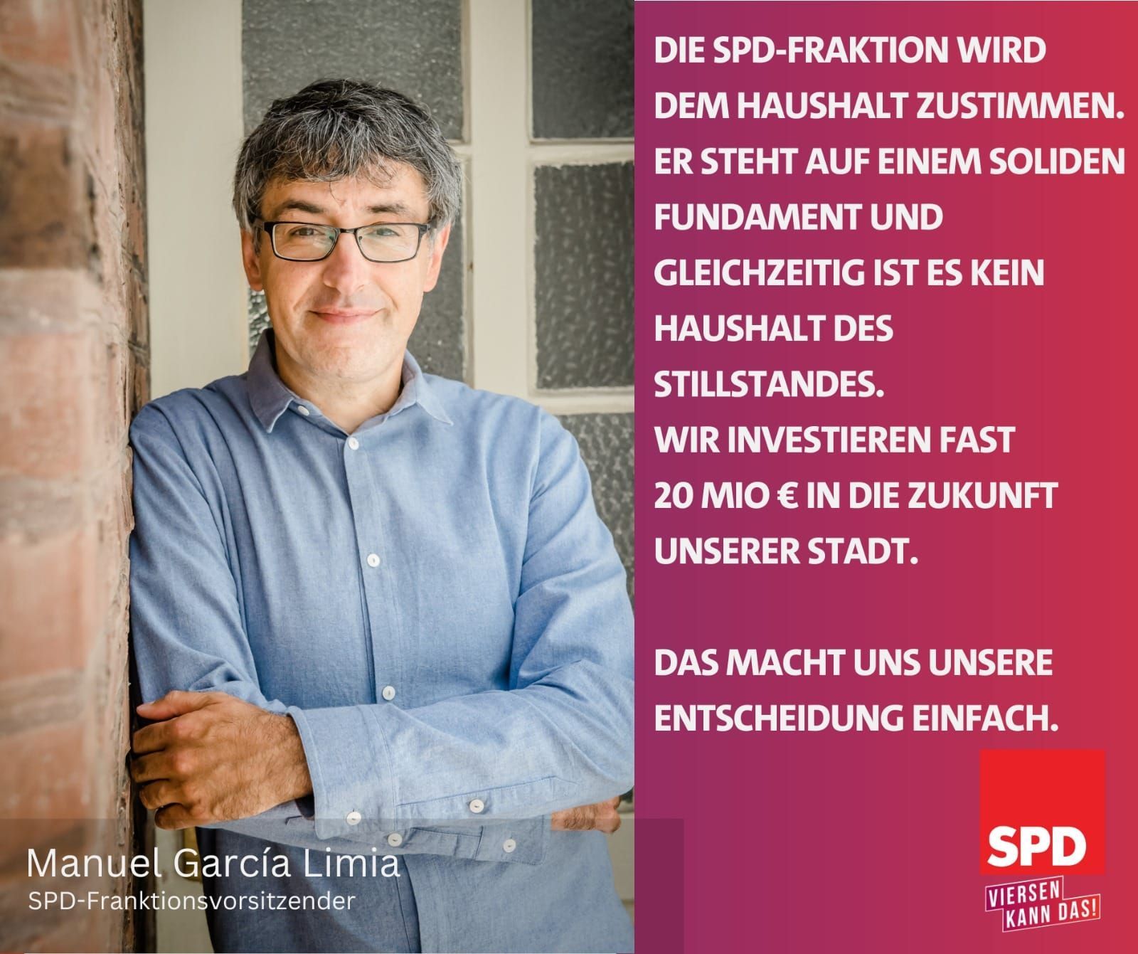 Der Fraktionsvorsitzende der SPD im Rat der Stadt Viersen beantwortete die Fragen der Rheinischen Post zum städtischen Haushalt 2024. Dabei betonte er, der Haushalt sei solide. Die Schwerpunkte der SPD lägen in den Bereichen Wohnen, öffentlicher Personennahverkehr sowie das ehrenamtliche Engagement von Bürger*innen in Vereinen, Verbänden und Organisationen. Es noch gibt besonderen Nachholbedarf beim Bau bezahlbarer Mietwohnungen. Für falsch hält García Limia die Haltung der FDP und der „Grünen im Rat der Stadt Viersen“, das Jazzfestival und die Sommerbühne gegeneinander auszuspielen. Eine Kürzung der freiwilligen Leistungen schließt er aus: „Sie stellen das Herzstück der kommunalen Politik dar“.